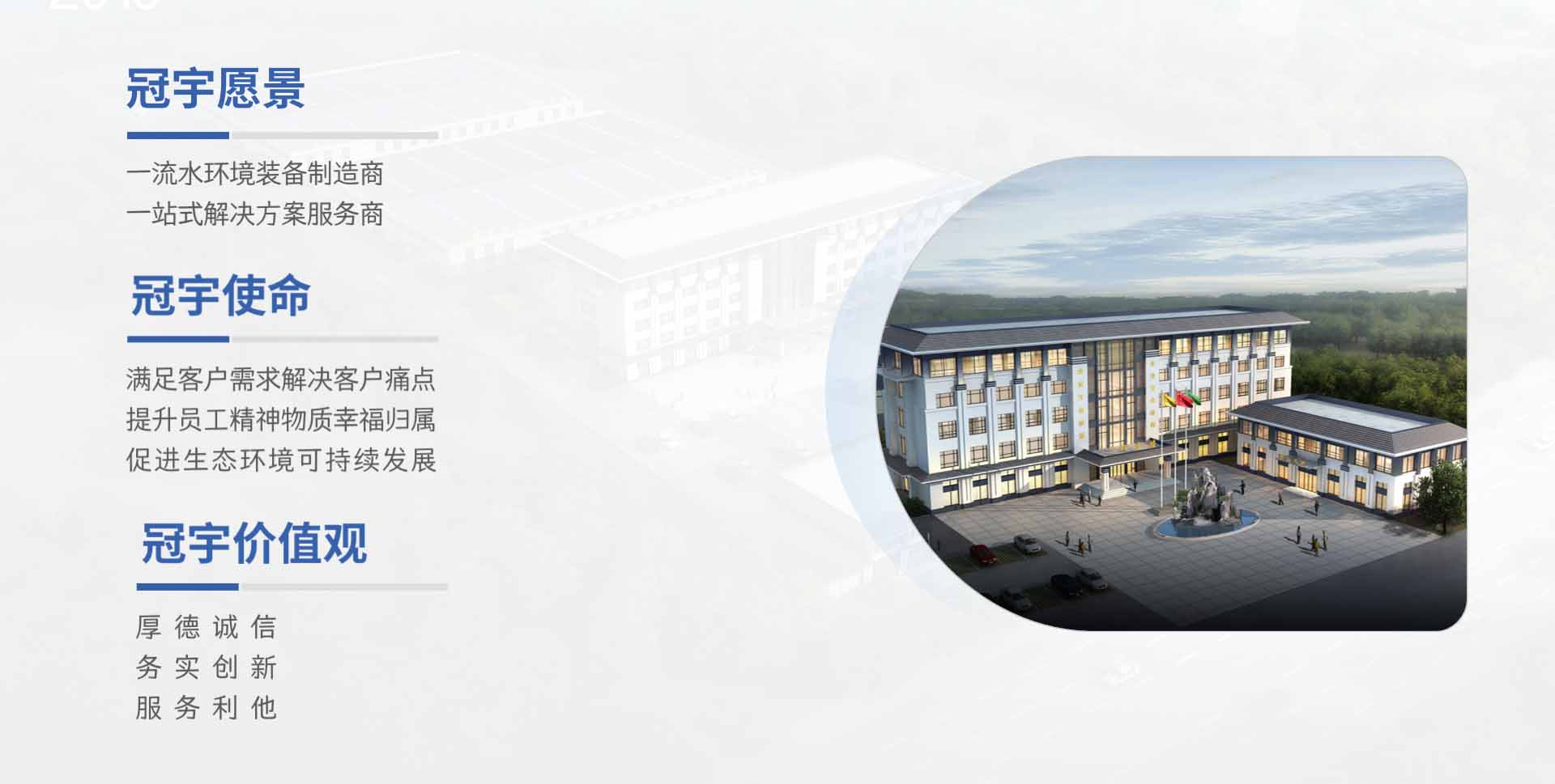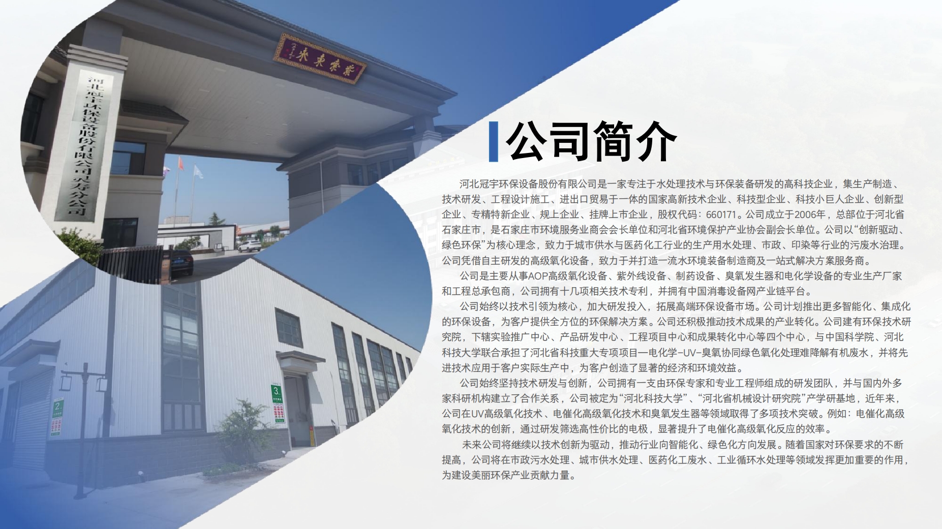 河北冠宇環(huán)保設(shè)備股份有限公司是一家專注于水處理技術(shù)與環(huán)保裝備研發(fā)的高科技企業(yè),集生產(chǎn)制造、技術(shù)研發(fā)、工程設(shè)計(jì)施工、進(jìn)出口貿(mào)易于一體的國(guó)家高新技術(shù)企業(yè)、科技型企業(yè)、科技小巨人企業(yè)、創(chuàng)新型企業(yè)、專精特新企業(yè)、規(guī)上企業(yè)、掛牌上市企業(yè),股權(quán)代碼:660171。公司成立于2006年,總部位于河北省石家莊市,是石家莊市環(huán)境服務(wù)業(yè)商會(huì)會(huì)長(zhǎng)單位和河北省環(huán)境保護(hù)產(chǎn)業(yè)協(xié)會(huì)副會(huì)長(zhǎng)單位。公司以“創(chuàng)新驅(qū)動(dòng)、綠色環(huán)?!睘楹诵睦砟?,致力于城市供水與醫(yī)藥化工行業(yè)的生產(chǎn)用水處理、市政、印染等行業(yè)的污廢水治理。公司憑借自主研發(fā)的高級(jí)氧化設(shè)備,致力于并打造一流水環(huán)境裝備制造商及一站式解決方案服務(wù)商。